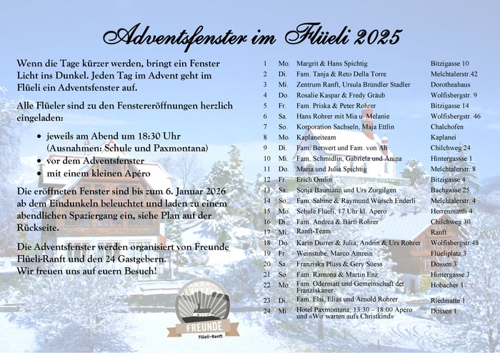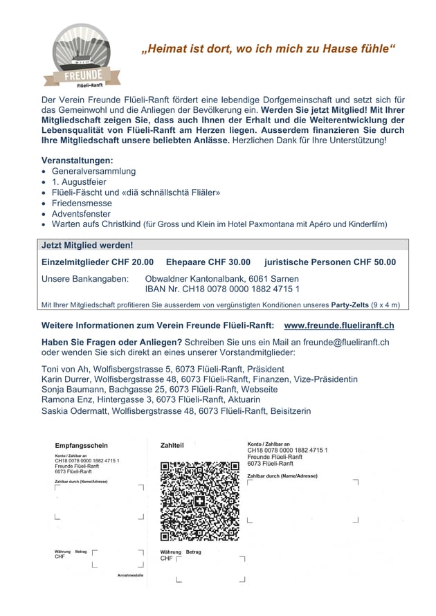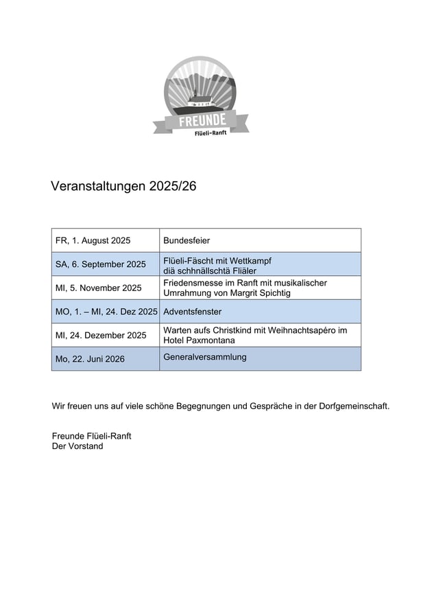 Herzlich willkommen liebe Flüeler/innen und Freunde des Flüeli-Ranft.